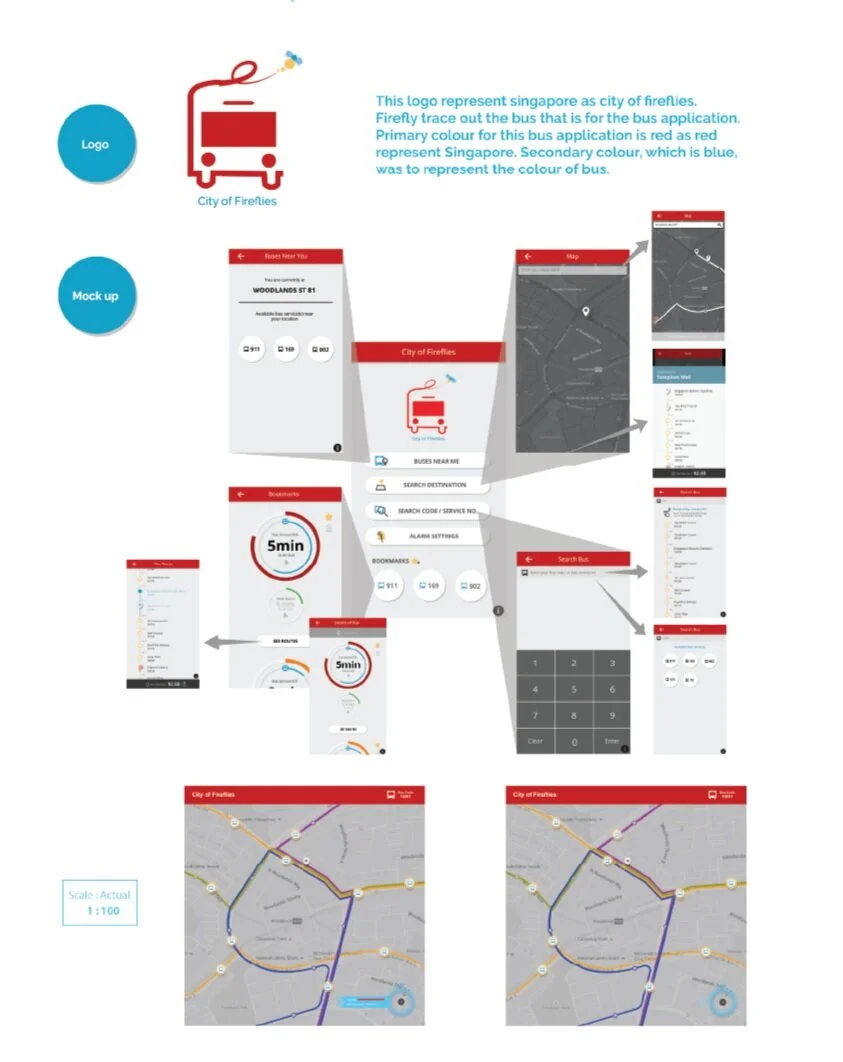 A straightforward and simple logo icon that is created with the combination of a bus icon and a firefly. To make the design look a little more interesting and personalised, a little swoop in the line work at the top indicates the swiftness of the movement and trail of the firefly. This then relates back to how the product is quick and efficient in terms of allowing the users to get their information quick and easy.